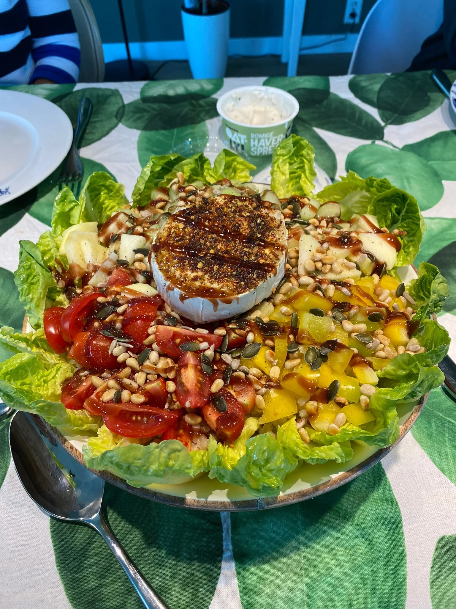 Snij van tevoren 1 appel, 8 dadels, 8 cherrytomaten, 1 komkommer, 1 paprika en 1 avocado. Vul een pan met 250 ml water per persoon en breng aan de kook. Leg het geitenkaas rondje in een ovenschaal, strooi wat bruschetta kruiden (Xenos) erover en een theelepel honing. Zet de grill aan op 200° en 10 minuten en leg de ovenschaal in de oven. Voeg 75g parelcouscous per persoon toe aan het kokende water en laat ca. 10 minuten zachtjes koken. Ondertussen maak je een salade schaal op met de blaadjes van twee Romaine slakroppen. Rooster de pijnboompitten tot ze lichtbruin zijn. Leg de parelcouscous in het midden van de schaal. Verdeel de appel, dadels, cherrytomaten, komkommer, paprika, avocado en pijnboompitten eroverheen. Leg de geitenkaas er in het midden bovenop. Bestrooi met peper en wat gevijzeld Himalaya zout (goed vanwege de mineralen) en als laatste verdeel je wat Crema di Balsamico Framboos (Jumbo, La Place) of Balsamico azijn eroverheen. Eet smakelijk!