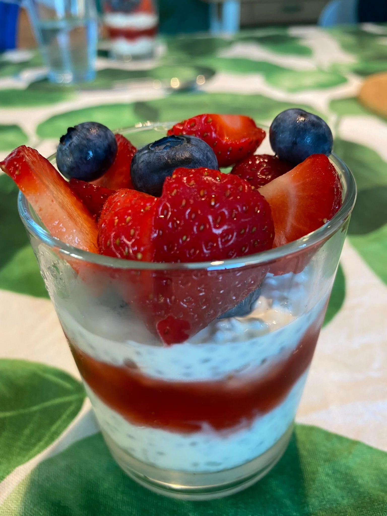 Doe 1 pak plantaardige yoghurt (Alpro) in een grote schaal. Doe hier een flinke hand chia zaadjes doorheen. Laat minimaal 30 min in de koelkast staan (de yoghurt trekt dan in de chia zaadjes, is goed voor de darmen!). Doe een laagje yoghurt met chia zaadjes in een glas, dan een laagje licht vloeibare aardbeienjam (zelf gemaakt of van de groenteboer) en weer een laagje yoghurt met chia zaadjes. Zet de glazen terug in de koelkast en wanneer het tijd is voor het toetje hoef je alleen nog maar wat fruit erbovenop te leggen, bijvoorbeeld blauwe bessen en aardbeien, of aardbeien en mango. Enjoy!