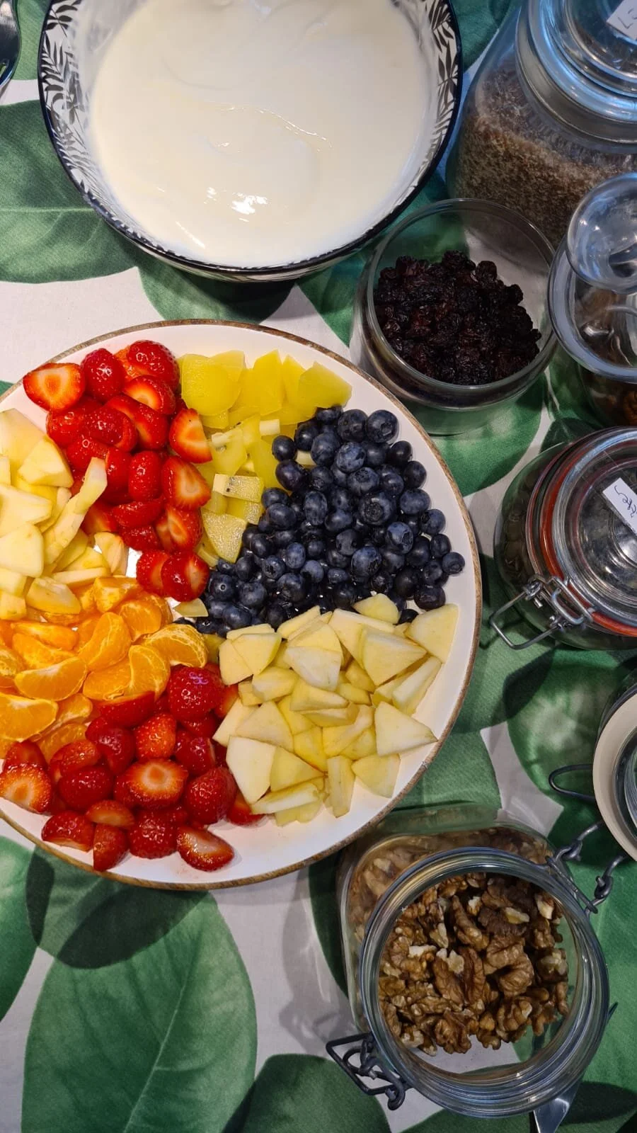 Kook 1 kopje water. Doe een handje vol biologische fijne havermout vlokken in een kom met 1 theelepel chia zaadjes. Het gekookte water gooi je over de havermout met zaden zodat het water erin trekt. Vervolgens doe je twee grote eetlepels met plantaardige yoghurt (Alpro) erbij en twee soorten fruit naar eigen keuze. Daarna kan je toevoegen wat je lekker vindt: kokosrasp, pompoenpitten, zonnebloempitten, rozijnen (haal echt van die lekkere op de markt of bij de groentenboer, gewoon, voor jezelf), pecannoten of walnoten en als afsluiter wat kaneelpoeder.